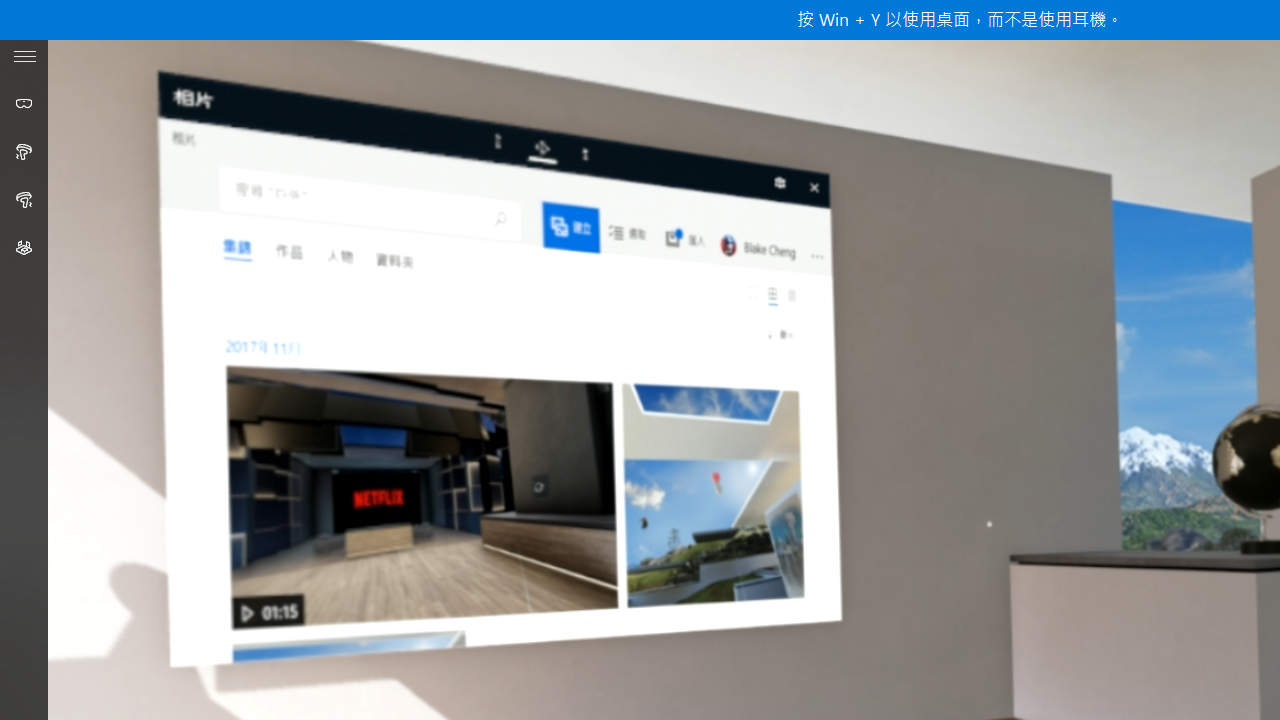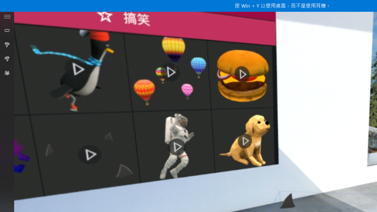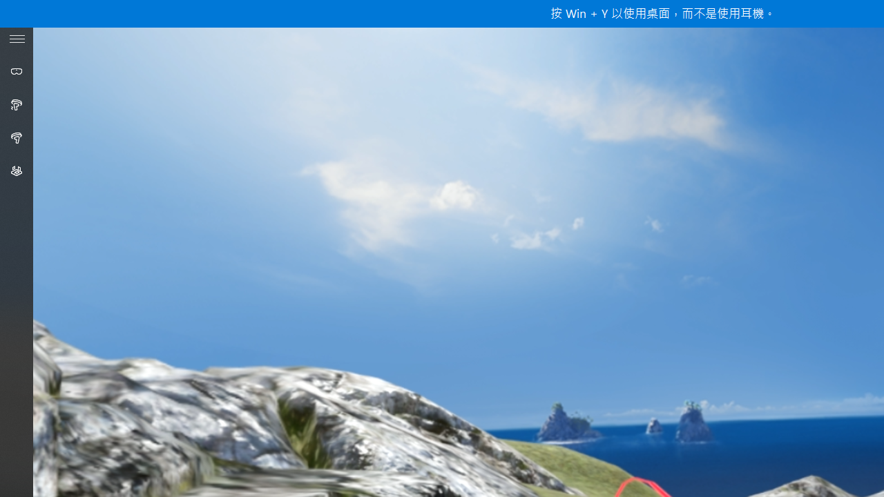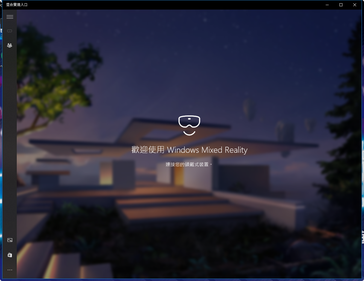 設定完成後就可以開始進行混合實境體驗啦!在左邊的工具列會顯示頭戴式顯示器與控制器的連接狀況,下方則是設定和專屬的 Windows 軟體市集。