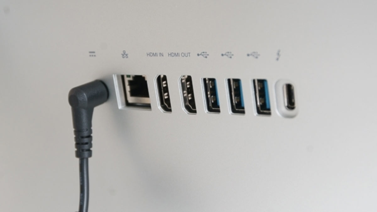 電腦後側還可以看到 I/O 端子埠配置,包含一組 USB-C 3.1、三組 USB 3.0、HDMI IN、HDMI Out、RJ-45 有線網路插孔與電源輸入插孔。