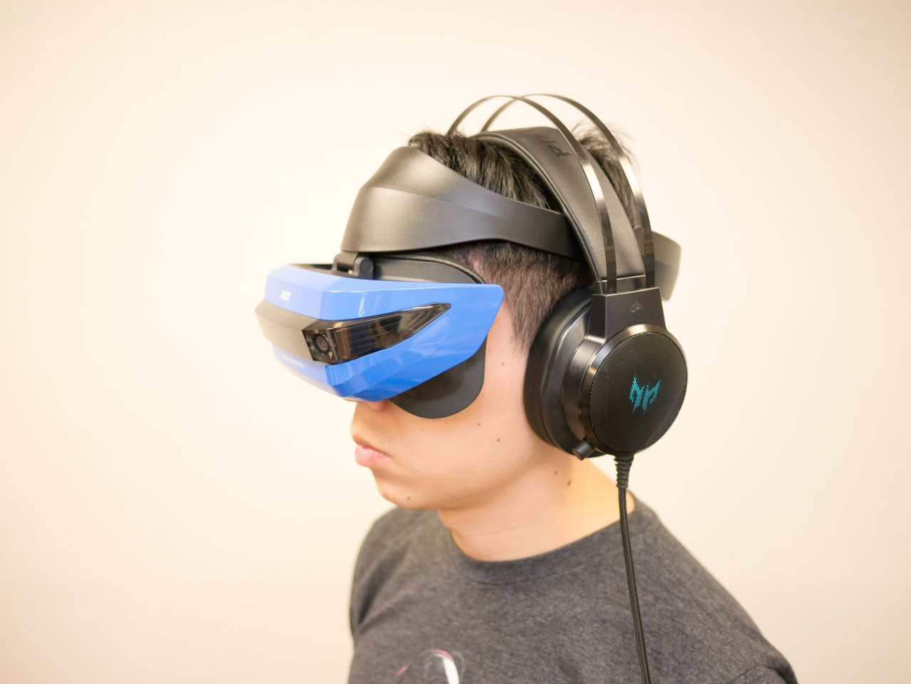 Acer Windows 頭戴式混合實境顯示器以藍黑雙色為設計,強調科技與未來感。