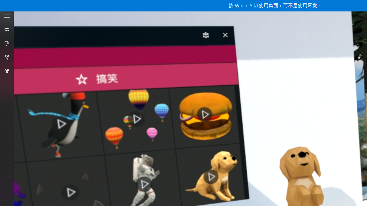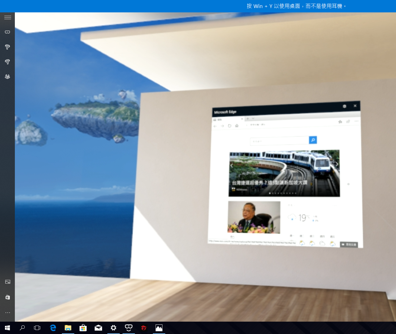 設定完成後就可以開始進行混合實境體驗啦!在左邊的工具列會顯示頭戴式顯示器與控制器的連接狀況,下方則是設定和專屬的 Windows 軟體市集。