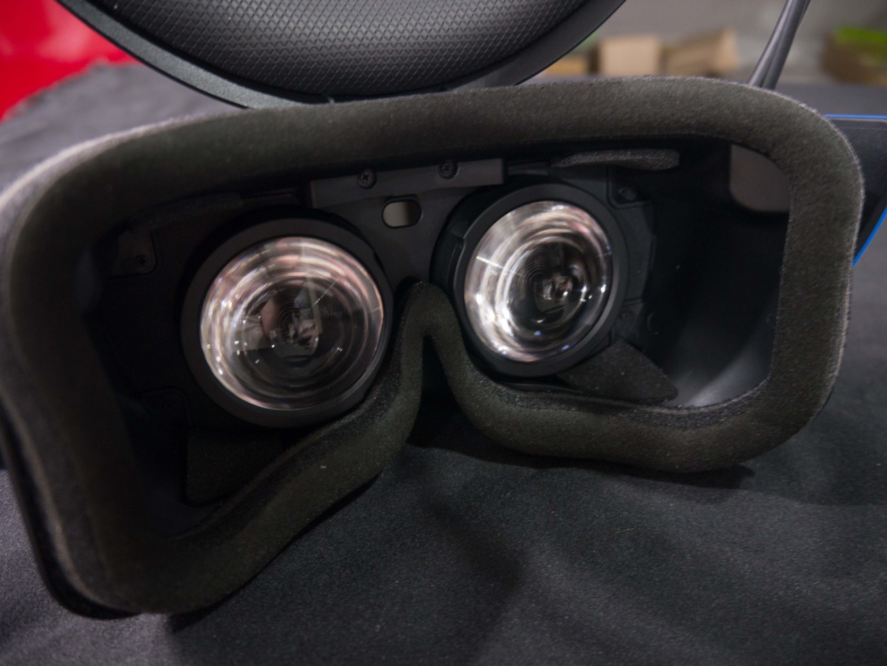 頭戴顯示器的「螢幕」就是這組雙眼鏡片,中間上面則是可以偵測使用者是否戴著頭戴顯示器的感應器。