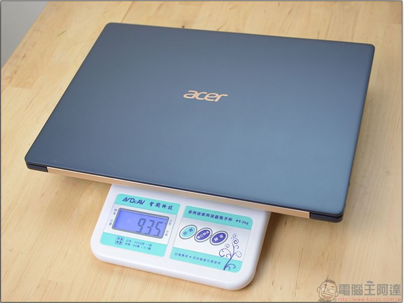 直接用電子秤測量,Swift 5 的機身重量只有 935 公克,就連一公斤都不到, C 編自己單手托著筆電使用也是相當輕而易舉,毫不費力。