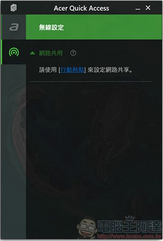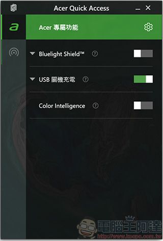 這項專屬於 Acer 的功能中,你可以開啟或關閉藍光防護、關機中 USB 為其他裝置充電功能與智慧色彩管理(Color Intelligence)功能,另外還可以從這項軟體中使用行動熱點來設定網路共享。