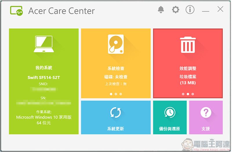 在這個軟體內,你可以很快速與容易地檢視自己的系統和軟體查看是否有更新,備份或還原電腦,清除多餘的垃圾以調整效能等,還可以從這裡找到尋求支援的方法。