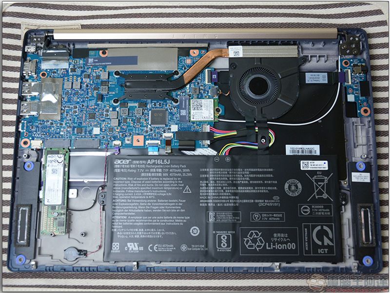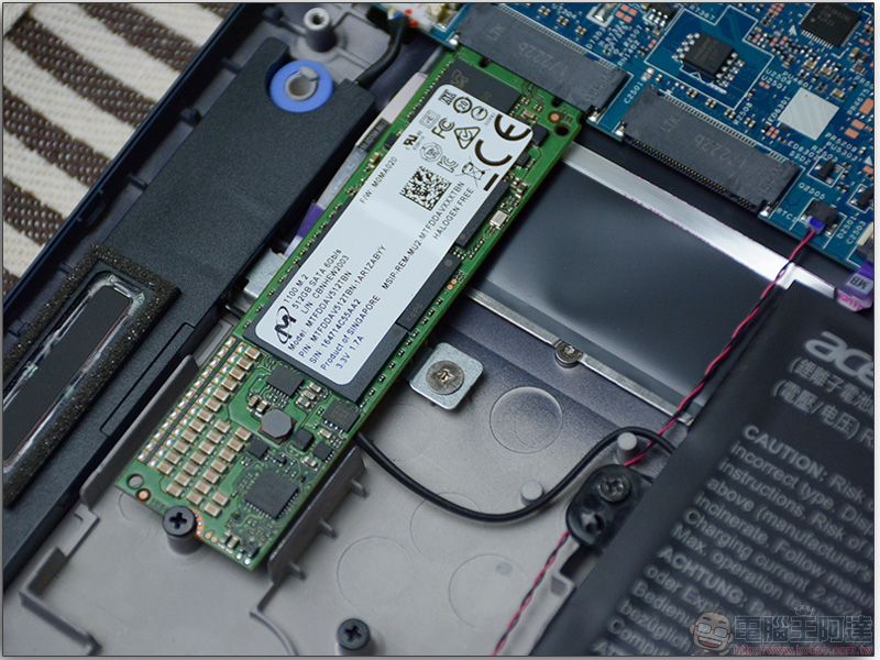 在擴充性方面,很多人都會把重要資料存放在電腦中,所以儲存容量經常不夠用,經過拆卸後可以在 Swift 5 中看到原有的 SSD 槽旁有一個空的 SSD 插槽,若你日後需要更大的儲存空間,可以將筆電帶到專業服務中心去,讓工程師幫你擴充儲存容量。 ※認真叮嚀:自己若不具備技術能力,請不要貿然嘗試自行拆機,務必尋求專業人員的協助與服務。