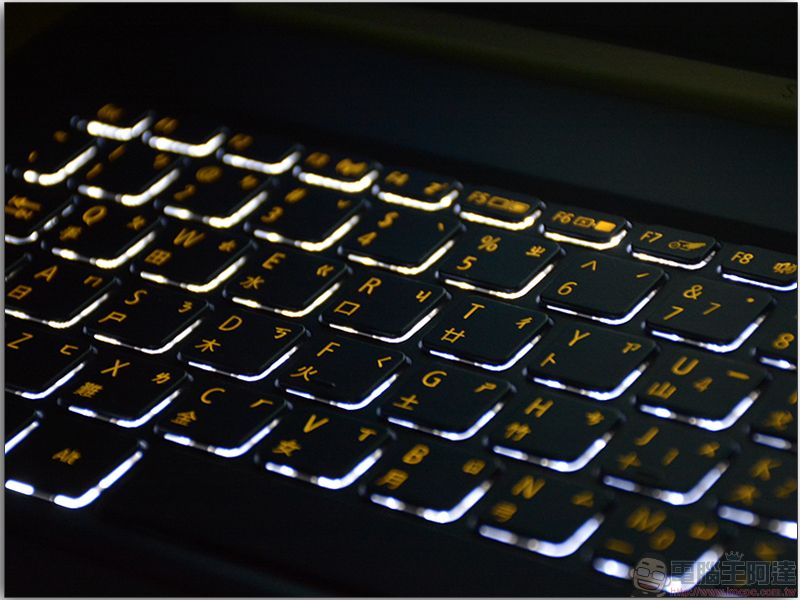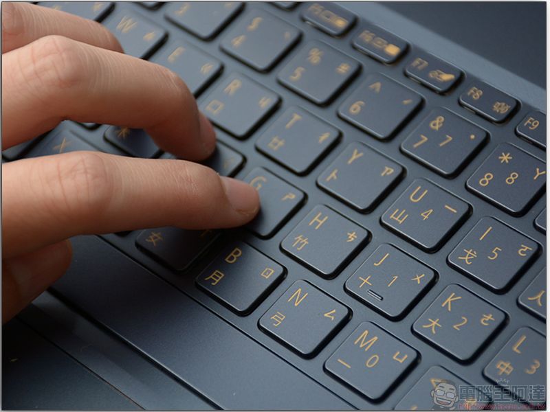 背光巧克力鍵盤上的配色與機身一樣,深藍色底搭配金色印字,打字起來回饋感算相當不錯。