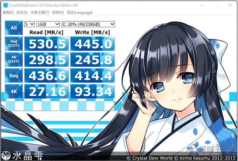 至於硬碟讀寫速度方面,用 Christal Disk Mark 水晶雫測量連續讀寫速度,得到的成績如上圖所示: