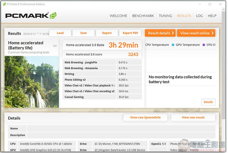 在 PCMark 的 Home 模式下進行電力續航測試,所得到的時間是 3 小時 29 分。