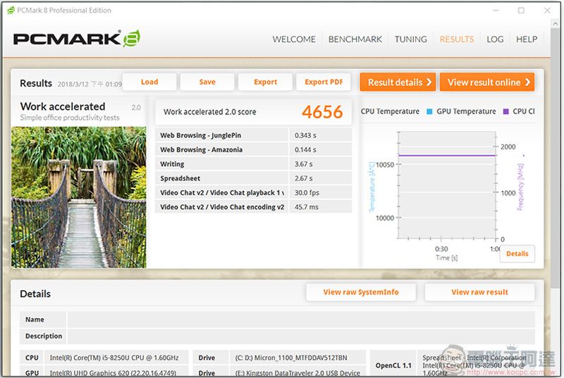 而在 Work 模式下,則是模擬商務工作時的使用情境,除了日常瀏覽網頁、觀看影片外還有文書處理等內容,得到的分數為 4656 分。