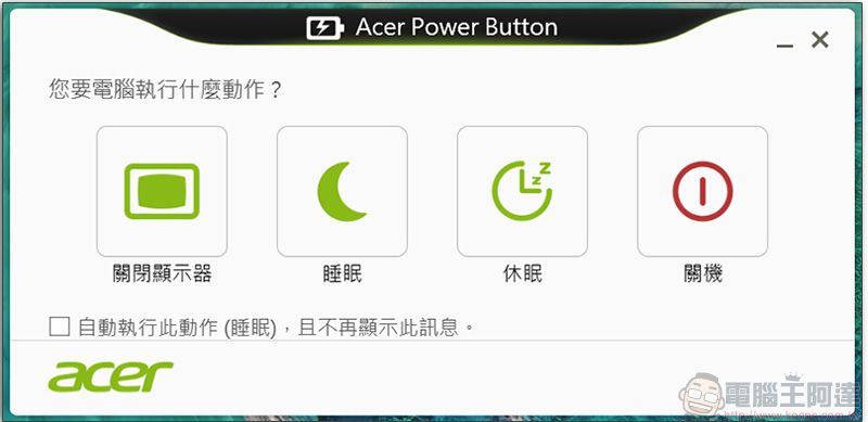 在這裡其實就是個螢幕上的電源管理面板,你可以從這裡選擇關閉顯示器、睡眠、休眠與關機。