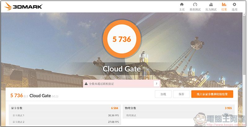 以 3D Mark 的 Cloud Gate 這款針對 Windows 電腦的測試工具對Swift 5 測試後,得到的分數為 5736 分。