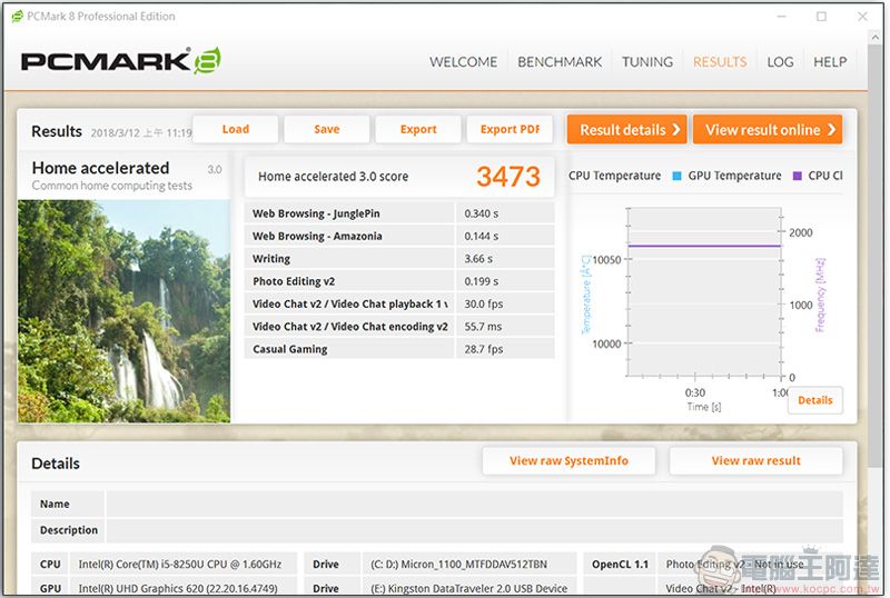 在 PCMark 的 Home 模式下,模擬一般人使用的情境,包含瀏覽網頁等較為輕量的使用,得到的分數為 3473 分。