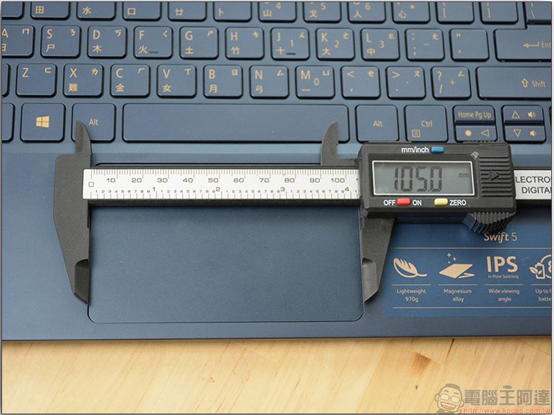 機身厚度測量後約為 15.2mm,從重量到體積的設計就是為了讓 swift 5 更符合高機動性的族群對攜帶方便的需求。