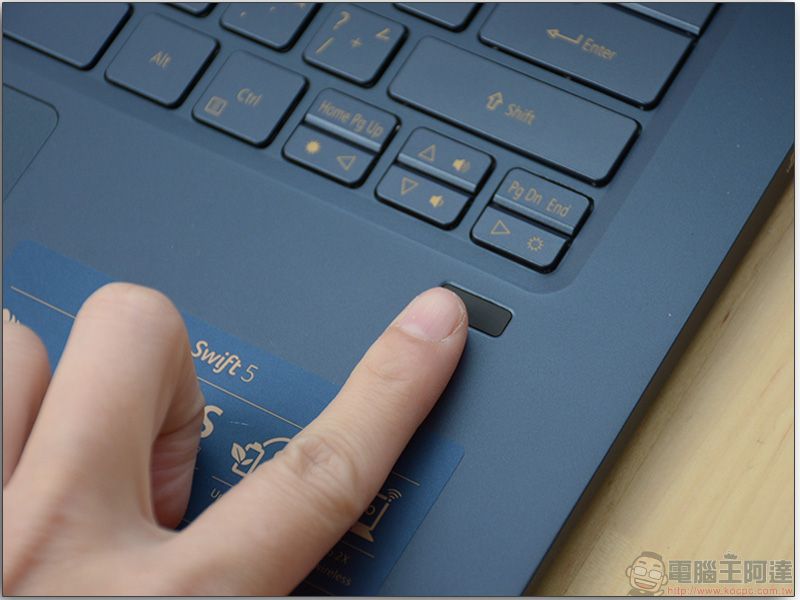 商務用筆電由於裡面放了很多商業資訊或個人數據,個人安全的重要性不在話下,Swift 5 上的指紋辨識器位於鍵盤右下方,位置上相當順手,不必特地抬手去解鎖。